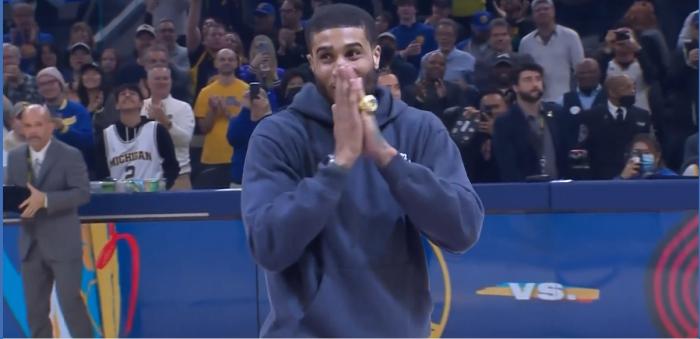 小佩顿首次重返勇士大通中心,赛前追梦格林拥抱小佩顿并且为他颁发总冠军戒指,老佩顿现场见证属于儿子的荣誉时刻,全场球迷为小佩顿鼓掌欢呼,库里、科尔等人都为小佩顿而开心鼓掌,满脸笑容乐开怀;小佩顿挥手向球迷致意。