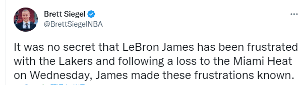 美记者Brett Siegel解读詹姆斯的冲冠言论,詹姆斯对湖人感到沮丧已经不是什么秘密了,在湖人输给热火后,詹姆斯让这种挫败感广为人知。