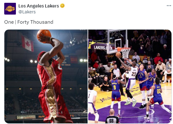 在湖人和掘金比赛第二节10分40秒,詹姆斯强突小波特上篮得分,打进创造40000分的伟大一球,比赛暂停后,詹姆斯冲着镜头比出4万分的霸气手势,获得比赛用球并且单手举球向现场球迷致意,在球迷热烈欢呼时,老詹还假装要把球踢向看台;赛后詹姆斯亲笔写下40000分,举起4万分纪录纸致敬张伯伦。