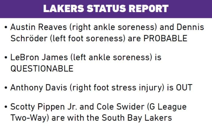 值得一提的是,湖人悍将安德森将会复出,他已经不在伤病名单中,此前安德森因脚踝伤势连续缺席了10场比赛,养伤20天终于能够伤愈归来。