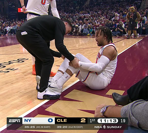 在尼克斯和骑士比赛进行到第一节11分13秒时,布伦森意外受伤倒地——布伦森急停跳投后痛苦倒地,捂着膝盖倒地不起;由于怕倒在场上影响比赛,布伦森忍痛走到场边并再次倒地,本想自己走下场,可膝盖不能用力,最终他被搀扶离场,直接返回更衣室。
