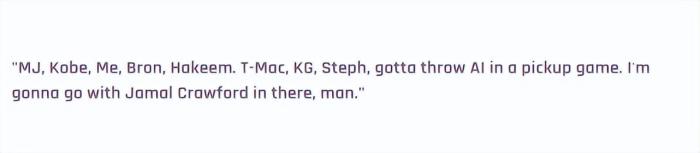 “乔丹、科比、我、詹姆斯、奥拉朱旺、麦迪、加内特、库里,”杜兰特一口气念出了8个名字,随后他又补充道:“野球赛必须要有艾弗森,我还要和贾马尔-克劳福德一起去。”听到自己的名字,克劳福德有点受宠若惊,哈哈大笑。不得不说,杜兰特的情商尽显无疑。