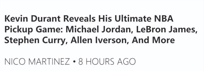 在克劳福德的这档节目中,杜兰特还透露自己模仿过一些球员打球,比如麦迪。当时他说麦迪和自己的体型相似,他试图学走麦迪的招牌动作。他是一个懂得欣赏的球员,希望通过吸取其他球星的特长,来让自己的球技再上一层楼。当然,这样的野球赛在现实中不可能发生,但也足够引起球迷们的讨论。大家认为这10人应该如何分组,能够打出更精彩的对决。