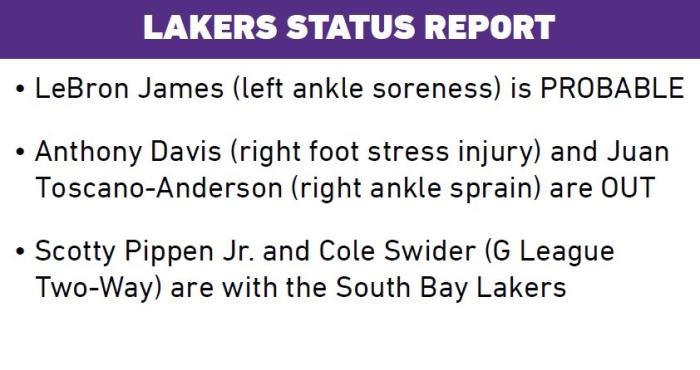 178直播12月25日讯 ,湖人官方公布年终大战对阵独行侠的伤情报告,詹姆斯(左脚踝酸痛)大概率带伤出战,浓眉(右脚应力性损伤)、托斯卡诺-安德森(右脚踝扭伤)缺席比赛,小皮蓬和斯威德都仍旧在发展联盟,继续为南湾湖人效力。