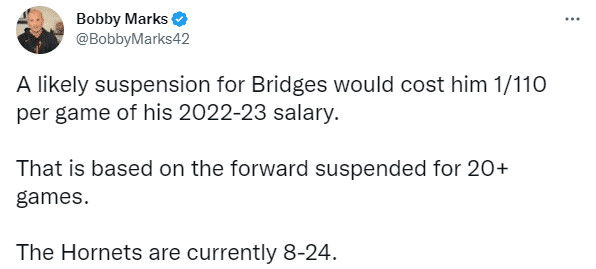 目前布里奇斯的案件仍在联盟的调查中,目前还不清楚他将面临多长时间的禁赛,禁赛将于新合同生效开始执行,NBA薪资专家Bobby Marks表示,若至少禁赛20场比赛,布里奇斯每场比赛会损失2022-23赛季年薪的1/110,目前黄蜂8胜24负。
