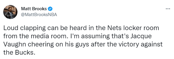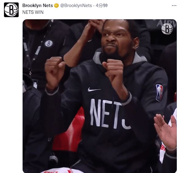 赛后篮网晒杜兰特坐在替补席庆祝一幕庆祝胜利;据篮网记者Matt Brooks报道,击败雄鹿后,篮网更衣室里响起了热烈的掌声,这可能是球沃恩为球员们赢得比赛而庆祝。
