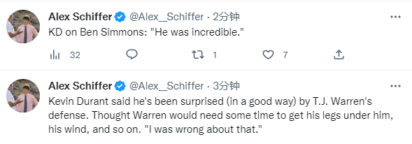 杜兰特夸赞西蒙斯的表现太不可思议;杜兰特还说他对沃伦的防守感到惊讶,他本以为沃伦需要一些时间才能控制自己的腿等等,抱歉我错了。