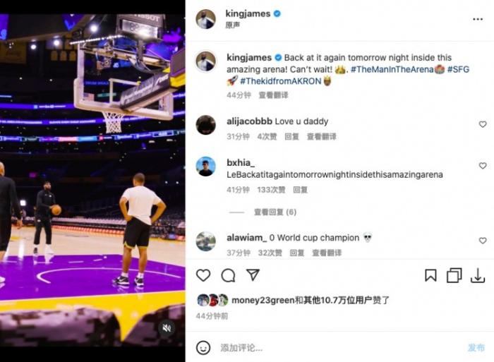 之后詹姆斯在INS上晒出他在国王球馆中训练的视频,并且配文写道:明天将再次在这个了不起的球馆里作战!等不及了!#球馆里的那个男人#追逐伟大#来自阿克伦的孩子。