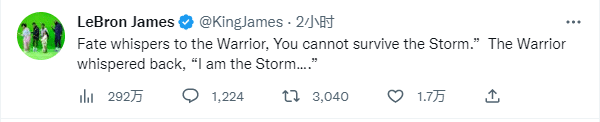 詹姆斯发推写道:命运向勇士低语道,‘你无法在这场暴风雨中幸存。’勇士低声回应道:我就是暴风雨……
