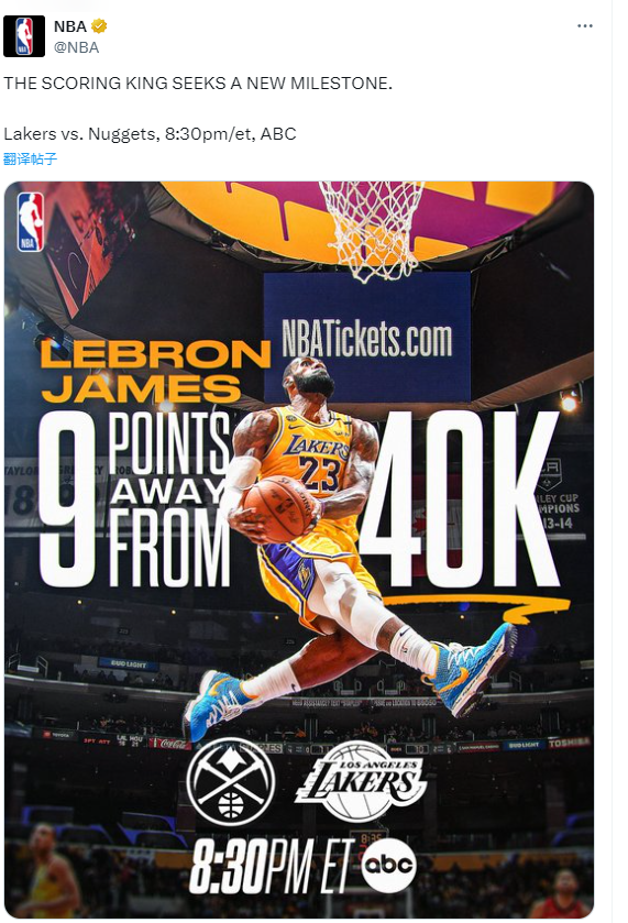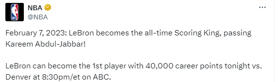 NBA晒出詹姆斯距离40000分仅仅只差9分的海报,晒出詹姆斯的生涯高光时刻,还发推列出詹姆斯超越众名宿加冕历史得分王的情况——2018年11月15日,詹姆斯总得分超越张伯伦升到历史第5位;2019年3月7日,詹姆斯超越乔丹升到历史第4位;2020年1月16日,詹姆斯超越科比升到历史第3位;2022年3月20日,詹姆斯超越卡尔-马龙升到历史第2位;2023年2月8日,詹姆斯超越贾巴尔成为NBA历史得分王。