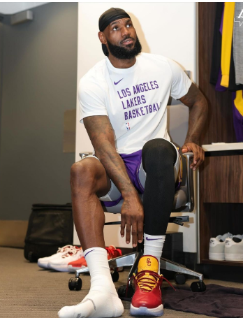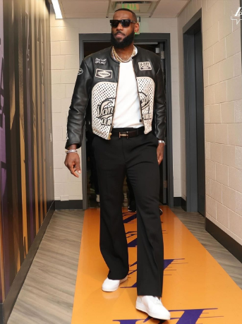 詹姆斯身穿黑色西装裤、黑白配色的潮流夹克搭配白色板鞋,戴着墨镜并且穿金戴钻十分霸气;距离比赛开打还有3个多小时,老詹便早早来到球馆中,提前热身备战。