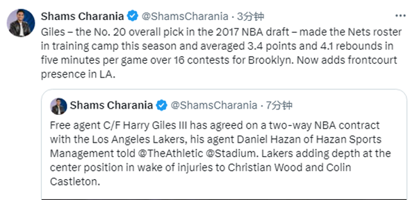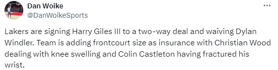 湖人记者Dan Woike跟进报道,湖人将用双向合同签下贾尔斯,并且裁掉迪伦-温德勒;湖人增加前场深度,伍德正在处理膝盖肿胀的伤病,卡斯尔顿则是手腕骨折。