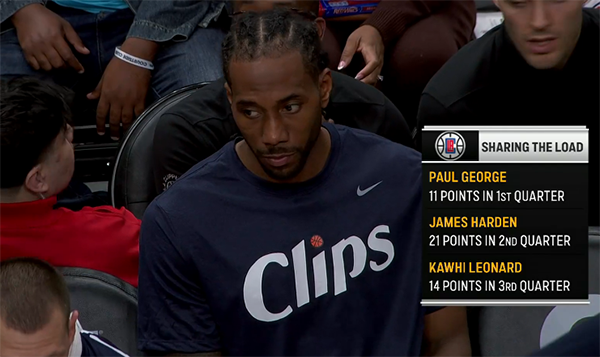 下半场,小卡第三节独砍14分,杀到禁区单手劈扣太疯狂,哈登贡献7分,在三巨头的带领下,快船领先25分进入末节;第四节快船牢牢掌控局面,比赛早早沦为垃圾时间。