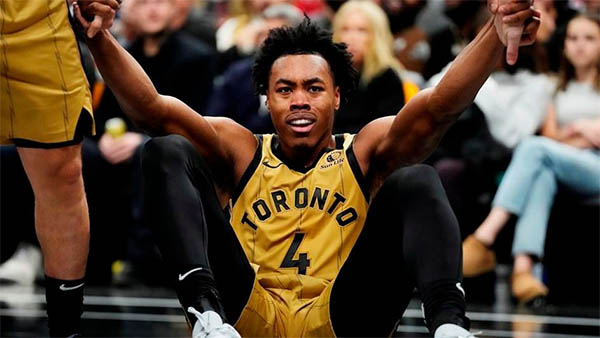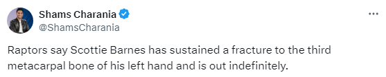 在猛龙和勇士比赛打到第二节时,斯科蒂-巴恩斯先是在接球时戳到手指,之后防守又戳到篮筐,手部受伤十分痛苦,无奈离场返回更衣室;猛龙官方宣布,巴恩斯本场比赛不会回归。
