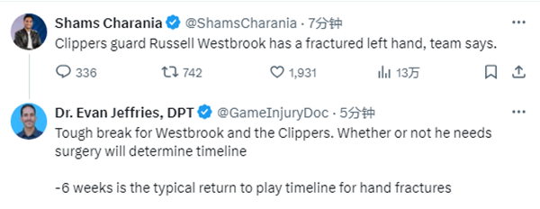 威少曾在2014年遭遇手部骨折,当时他因伤缺席了4周;对于威少的伤情,医学专家Evan Jeffries表示,对于快船和威少来说,都是一次打击,是否需要手术将决定复出时间表,一般需要休养6周。