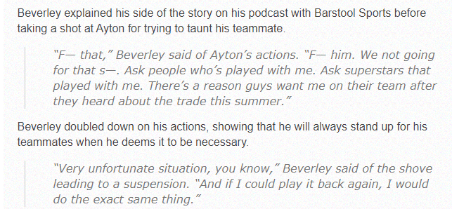 贝弗利还表示他对自己被禁赛感到非常不幸,但如果再次发生这样的事,我会做同样的事(为队友出头而揍别人)。