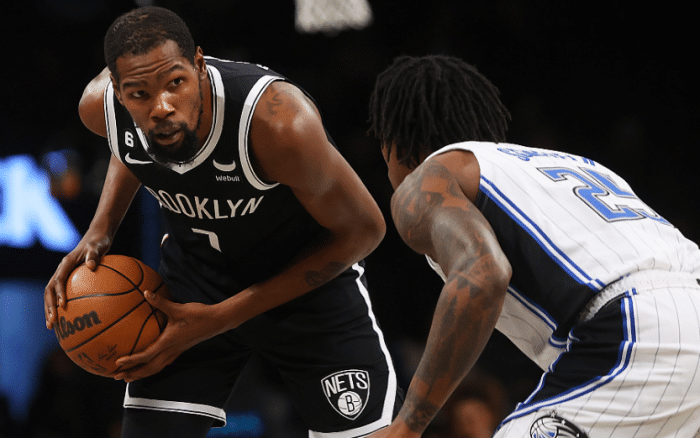 末节,魔术反扑,9分09秒杜兰特重新上场,KD再中三分,再秀无解中投杀招,魔术强行保持悬念,一番对阵最终篮网109-102击败魔术拿下胜利;赛后奥尼尔打断杜兰特采访,和KD拥抱,之后杜欧做出经典的庆祝动作,欧文离场时,KD摸了一下他的脑袋。