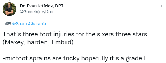 医学专家详解恩比德的伤情,Evan Jeffries表示76人三位球星都遭遇脚伤的困扰,恩比德的中足扭伤很棘手,希望是一级扭伤。