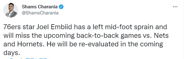 178直播11月22日,费城76人又遭重创,哈登、马克西之后,恩比德也伤停了,76人官方宣布恩比德因左中足扭伤将至少缺席接下来的两场比赛,76人三大球星都确定无缘对阵篮网;医学专家表示恩比德的伤情很棘手,平均缺席11场比赛。