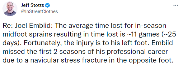 Jeff Stotts发推写道:赛季中足扭伤导致的平均缺席时间约为 11 场比赛(大概25 天)。幸运的是,受伤的是他的左脚。因为他的另一只脚曾遭遇应力性骨折,因伤错过了职业生涯的前两个赛季。