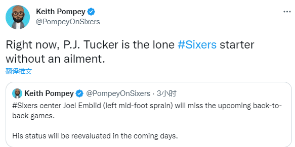 根据76人队记Keith Pompey的报道,再加上此前受伤缺席的哈登、马克西和哈里斯,目前76人唯一没有伤病的首发仅剩PJ-塔克一人。