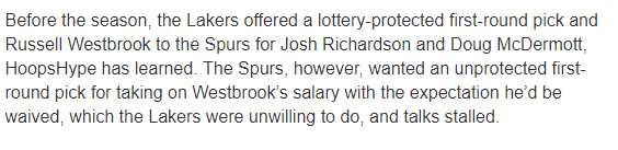 具体方案为:湖人提供一个受保护首轮签和威少,从马刺换来约什-理查德森和道格-麦克德蒙特,但马刺还想要一个不受保护的首轮签来承担威少的薪水,并期望他可以被裁掉,湖人不愿意这样做,最终双方的谈判陷入僵局。