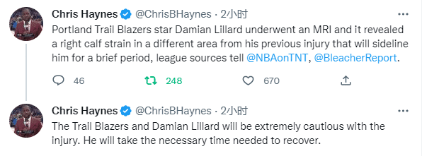 178直播11月21日,利拉德的检查结果曝光,据名记Chris Haynes报道,利拉德接受核磁共振检查,伤情确诊为右小腿拉伤,这与之前受伤的部位不同,他将缺席近期的比赛。
