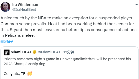 Tim Reynolds则表示,通常被禁赛的球员在比赛当天不允许进入球馆,NBA允许托布明晚前往丹佛球馆领取他的总冠军戒指,在这种情况下,NBA做出了正确的特例。