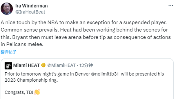 178直播02月29日,迈阿密热火官方宣布,在明天客场对阵掘金赛前,托马斯-布莱恩特将领取总冠军戒指;目前托布正处于禁赛期,热火记者表示在热火队的努力下,NBA联盟为他破例,托布必须在开球前离开球馆。