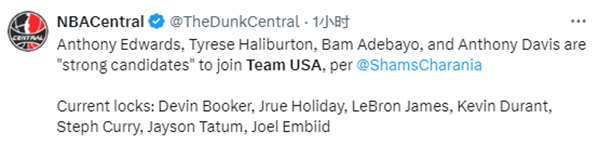 据名记shams报道,在美国男篮最近的讨论中,詹姆斯、杜兰特、库里、恩比德、塔图姆会是美国男篮巴黎奥运梦之队的核心成员,朱-霍乐迪和布克也在核心阵容之中(除非他们遭遇意外伤病);另外浓眉、阿德巴约、爱德华兹和哈利伯顿也是入选梦之队的有力候选者。