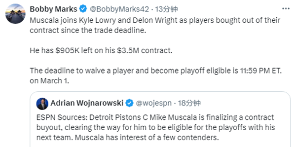 178直播02月28日讯,据ESPN名记Woj报道,穆斯卡拉将和活塞达成买断协议,多支争冠球队对他有意,3月2日前签约才能为新球队征战季后赛。