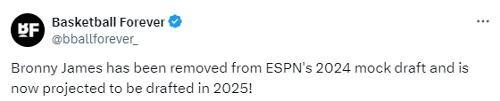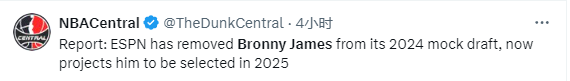 ESPN模拟布朗尼将在2025年第39顺位被选中,美媒NBACentral发推写道:ESPN已经将布朗尼从2024年选秀中除名,现在预计他将在2025年被选中。