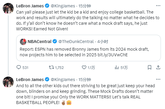 詹姆斯转发布朗尼2024年选秀被除名并且将在2025年被选中,发推写道:你们能不能让孩子去做孩子该做的事,享受大学篮球,无论他决定做什么,努力最终都会起到决定性作用。他不在乎模拟选秀说了什么,他只是在努力,一切都是挣来的而不是给予的!”