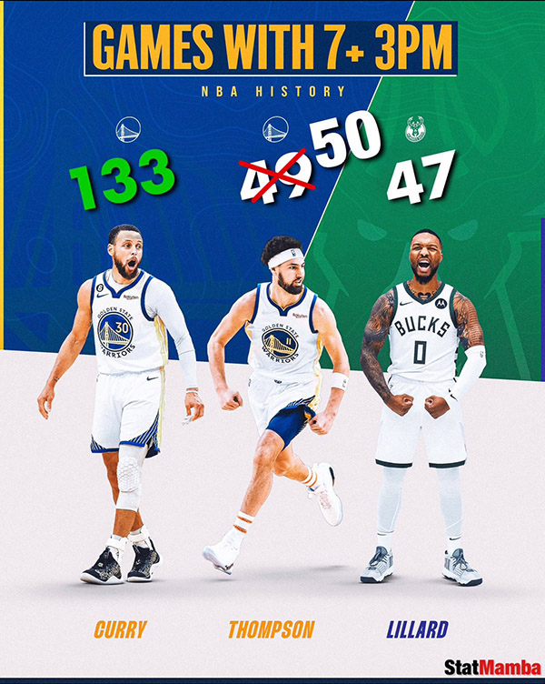 2、克莱生涯第50次单场至少命中7记三分,也是仅次于库里排在历史第二位