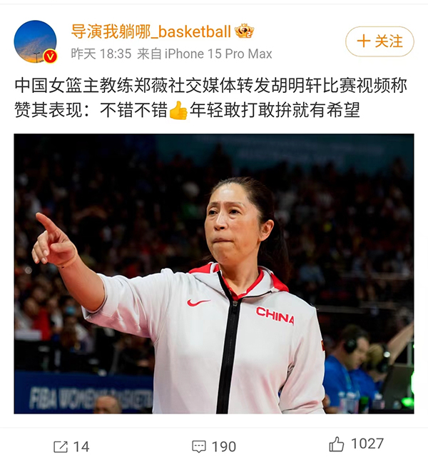 男篮输球,球员被骂成为了必然,比如说胡明轩,虽然胡明轩拿到了20分4篮板,但是胡明轩下半场的命中率不高还是被很多球迷质疑,不过正所谓内行看门道,外行看热闹,在胡明轩被批评的时候,女篮主教练郑薇也是站出来为胡明轩出头,郑薇在社交媒体上转发了胡明轩的视频表示:“不错不错,年轻敢打敢拼就有希望。”郑薇的喊话也是让很多球迷质疑声消退了。