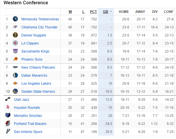狂野西部太乱了,每年到了这个阶段,西部都是乱成一锅粥,目前西部具体排名——
