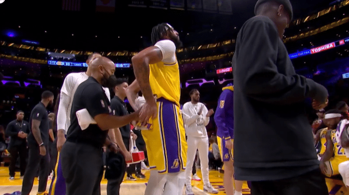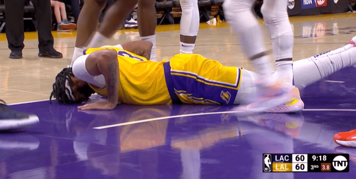 浓眉重摔倒地这一幕真是太惊险,浓眉真的伤不起;不过第三节6分49秒,湖人暂停,浓眉下场休息,并且站在场边接受临时治疗,并且戴上护具,站在球员通道附近;浓眉的心情很不错,和别人有说有笑。