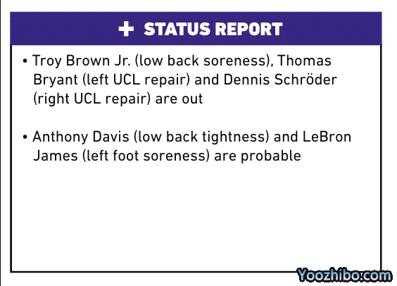 湖人三巨头揭幕战合砍77分惨败勇士,下一场他们将在主场对阵快船,洛城德比将在明天开打;湖人全队五员大将在伤病名单上,詹眉两大巨头在列,三大新援继续伤停,不过威少的腿筋已痊愈。