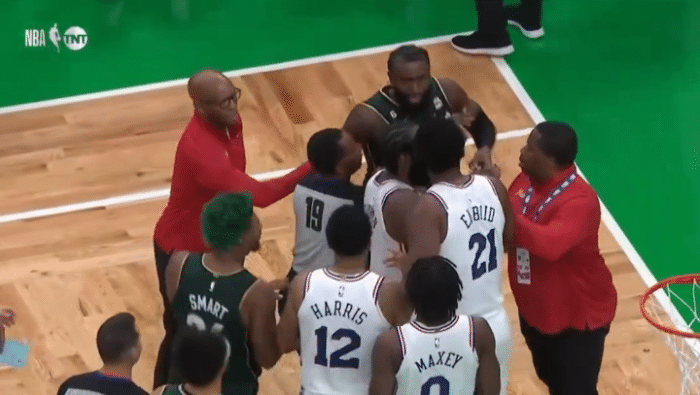 第三节11分41秒,恩比德抢篮板时夹住了斯玛特的手臂,绿军悍将倒地后捂着手臂,随后斯玛特从背后伸手拉拽恩比德的小腿,恩比德也倒地,布朗和恩比德发生激烈口角,并且相互拉拽,哈登第一时间劝架充当和事佬,最终裁判吹罚斯玛特技犯,布朗和恩比德都逃过一劫,76人获得一罚一掷,哈登罚球得分。
