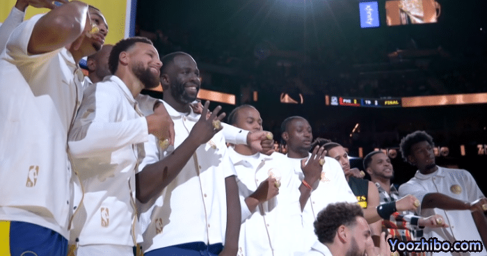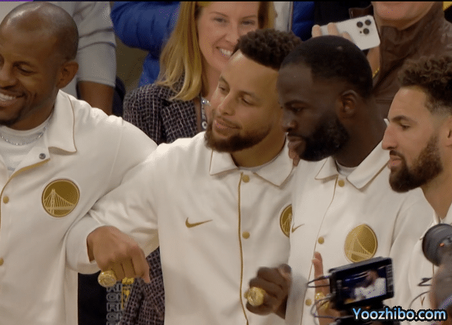 赛前勇士全队正式领取冠军戒指,勇士老板率先领取戒指,之后迈尔斯和汤普森、库里发表讲话,汤普森表示库里是NBA史上最伟大的射手,库里谦虚直言还不是,库里上场后全场球迷高呼MVP。