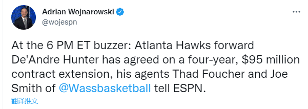 178直播10月18日,据ESPN名记沃纳罗斯基报道,德安德烈-亨特的经纪人透露,亨特已经同意与老鹰达成4年9500万美元的提前续约合同,未来5年继续联手特雷-杨冲击总冠军。