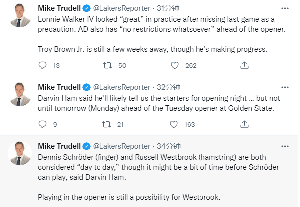 哈姆表示新赛季开始时浓眉不会受到任何限制,预计揭幕战对阵勇士将首发出战;威少(腿筋)和施罗德(拇指)都被列入每日观察名单,威少有可能参加揭幕战,此前名记Chris Haynes报道,威少的左腿筋无结构性损伤,仅仅只是左腿筋酸痛,不过施罗德可能需要休养一段时间才能上场比赛。