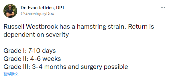 医学专家Evan Jeffries详解威少的伤情,发推写道:威少的腿筋拉伤,回归取决于受伤的严重程度;一级拉伤需要休养7-10天;二级拉伤需要休养4-6周;三级拉伤需要休养3-4个月,可能需要手术。