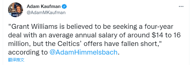 178直播10月14日,据凯尔特人记者Adam Kaufaman报道,格兰特-威廉姆斯想要一份最高4年6400万美元的续约合同,但凯尔特人给的报价低于格威的预期;双方都有意达成4年合同,但续约金额暂未谈拢,而且谈判陷入僵局。
