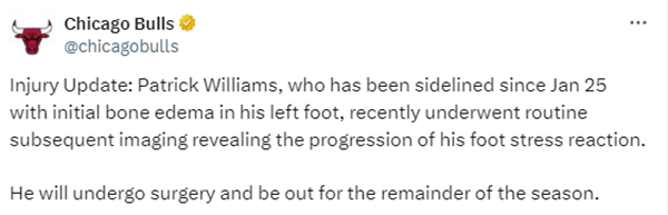 178直播02月24日讯 ,公牛官方宣布,帕特里克-威廉姆斯因左脚骨水肿将接受脚部手术,因伤赛季报销;帕威成为鲍尔、拉文之后队内第三位因伤报销的球员。