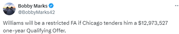 帕威因伤赛季报销,薪资专家Bobby Marks表示:如果公牛给帕威一份1年1297万美元的资质报价合同,今夏他将成为一名受限制球员。