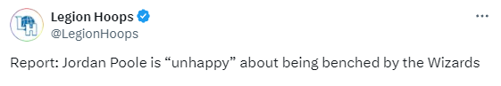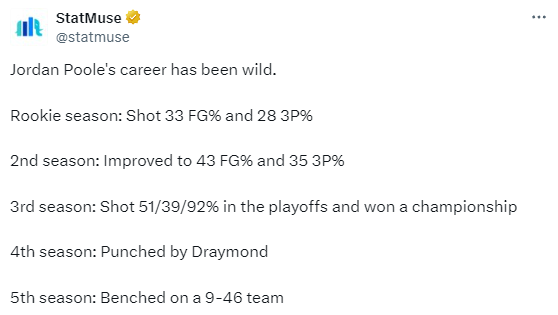 178直播02月24日讯 ,据美媒Legion Hoops报道,普尔不满被贬为替补,公开发声时表达了内心的不满;美媒列普尔大起大落的5年生涯——第三年跟随勇士夺冠,第四年遭追梦拳击,现在沦为摆烂球队的替补球员。