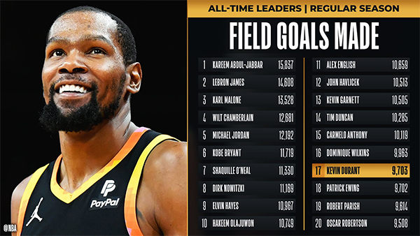 另外杜兰特生涯进球总数超越帕特里克-尤因升到历史NBA历史第17位。