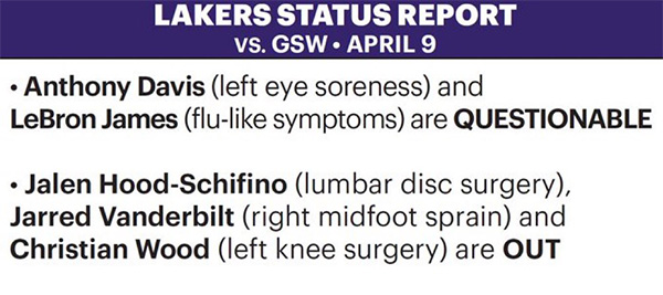 178直播讯 北京时间4月9日,湖人和勇士关键卡位战的伤病报告出炉,詹姆斯生病和浓眉左眼酸痛都是可能出战,湖人三将继续伤停;勇士队库里轮休一场后将回归,维金斯大概率复出。
