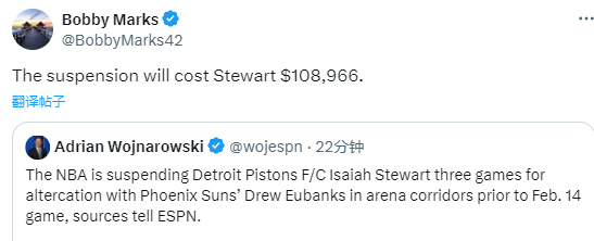 178直播02月23日讯 ,NBA官方公布罚单,活塞球员斯图尔特因在球员通道挥拳击打尤班克斯,被联盟禁赛三场比赛,损失超10万美元。